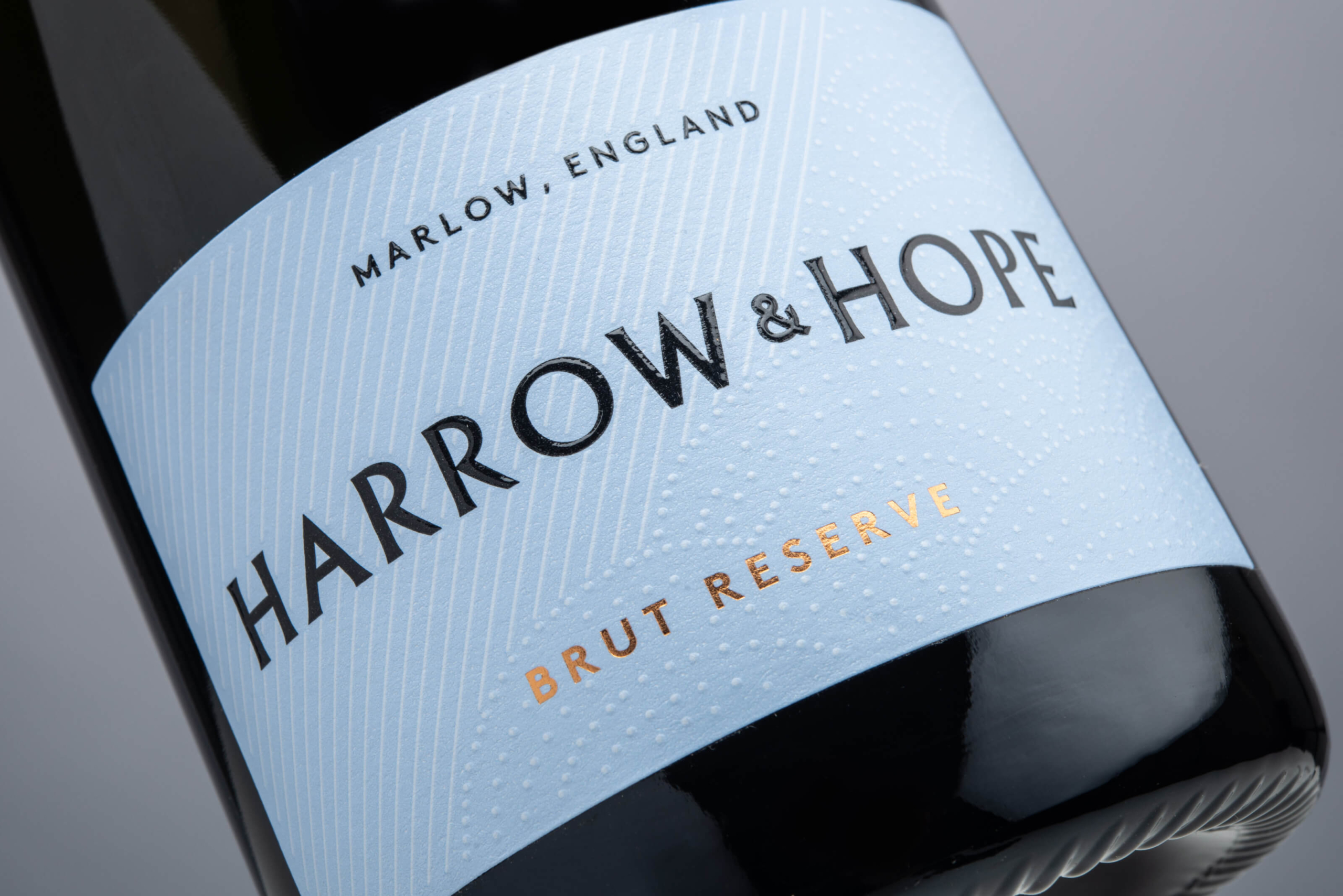 Avoiding the familiar palette of cream and gold, Harrow & Hope labels stand out in classic English hues, evoking Farrow & Ball or Wedgewood. the story of hard work rewarded to alluded to with a subtle graphic emboss, changing texture where “Harrow” becomes “Hope”.
